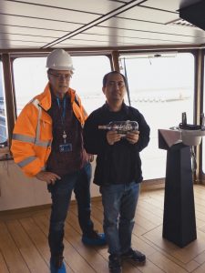 Nu was het bijna 3 uur en vorige week bezocht ik op dat tijdstip de Polar Queen. Ik heb toen veel kunnen vertellen over Jezus, met veel mensen gebeden en ik mocht altijd terug komen. Nu echter waren de meeste mensen of aan het werk of aan wal of ze lagen te slapen. Ik vroeg naar de tweede officier die ons vorige week steeds zo vriendelijk had begeleid en erg open was voor het evangelie. Hem wilde ik een cadeau geven. We konden naar de brug komen. In de veronderstelling dat ik de weg wel kende gingen we zonder begeleiding. Met de lift naar de 5e verdieping en toen maar zoeken naar de laatste trap die met enig dwalen werd gevonden. Het cadeau dat ik wilde geven was een scheepjesfles. Zelden iemand zo blij gezien met een geschenk. Het werd gelijk gefotografeerd “For my family” vertelde hij ons. Ook wij moesten op de foto voor het thuisfront. Uiteindelijk werd de fles zorgvuldig verstopt, zodat geen andere zeeman zich dit pronkjuweel zou kunnen toe-eigenen. Ik merkte dat de bijbel en bijbelstudie die ik vorige week had overhandigd op een tafel lagen. Het wordt gebruikt! Tot slot nog het evangelie in het kort kunnen delen met de wachtman en hem uiteindelijk ook een bijbel en ijsmuts overhandigd. Het was weer een waardevolle dag. God is goed!